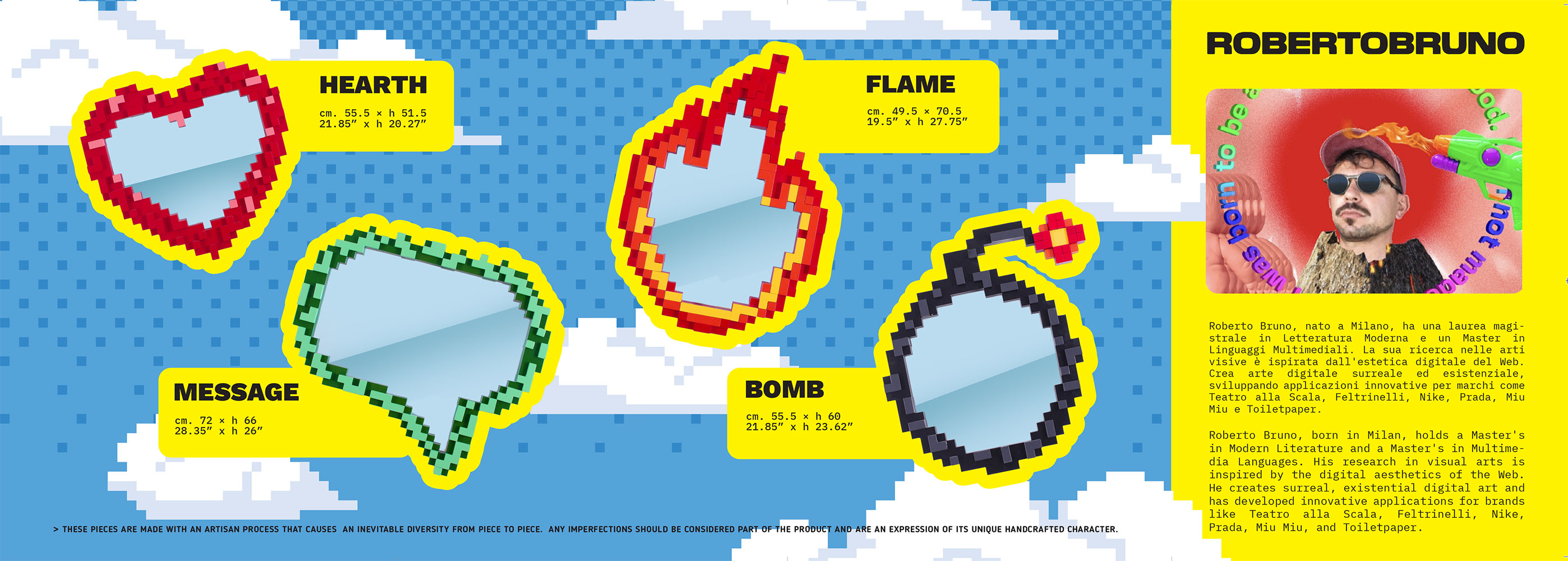 He designed the Pixel Mirror collection for Seletti and continued his artistic journey with interactive installations for brands such as Engine. At the same time he developed works with a highly personal and autobiographical character, exhibited in various exhibition spaces that can be consulted on robertobruno.art.